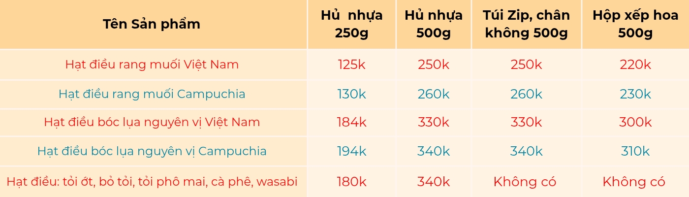 Hạt điều Minh Khang vừa bán và xuất khẩu hạt điều nhân trắng cho khắp các nhà máy trên thế giới để làm sữa, làm bánh hay các loại lương thực khác vừa cung cấp ra thị trường các loại hạt điều đã chế biến như: Hạt điều rang muối, Hạt điều bóc lụa nguyên vị, Hạt điều tỏi ớt, Hạt điều tỏi phô mai, Hạt điều cà phê, Hạt điều bơ tỏi, Hạt điều Wasabi, ... và tất cả đều là hàng được làm từ Hạt điều loại I đầu mùa có kích thước hạt lớn nhất (Cả hạt điều Việt Nam và hạt điều Campuchia)