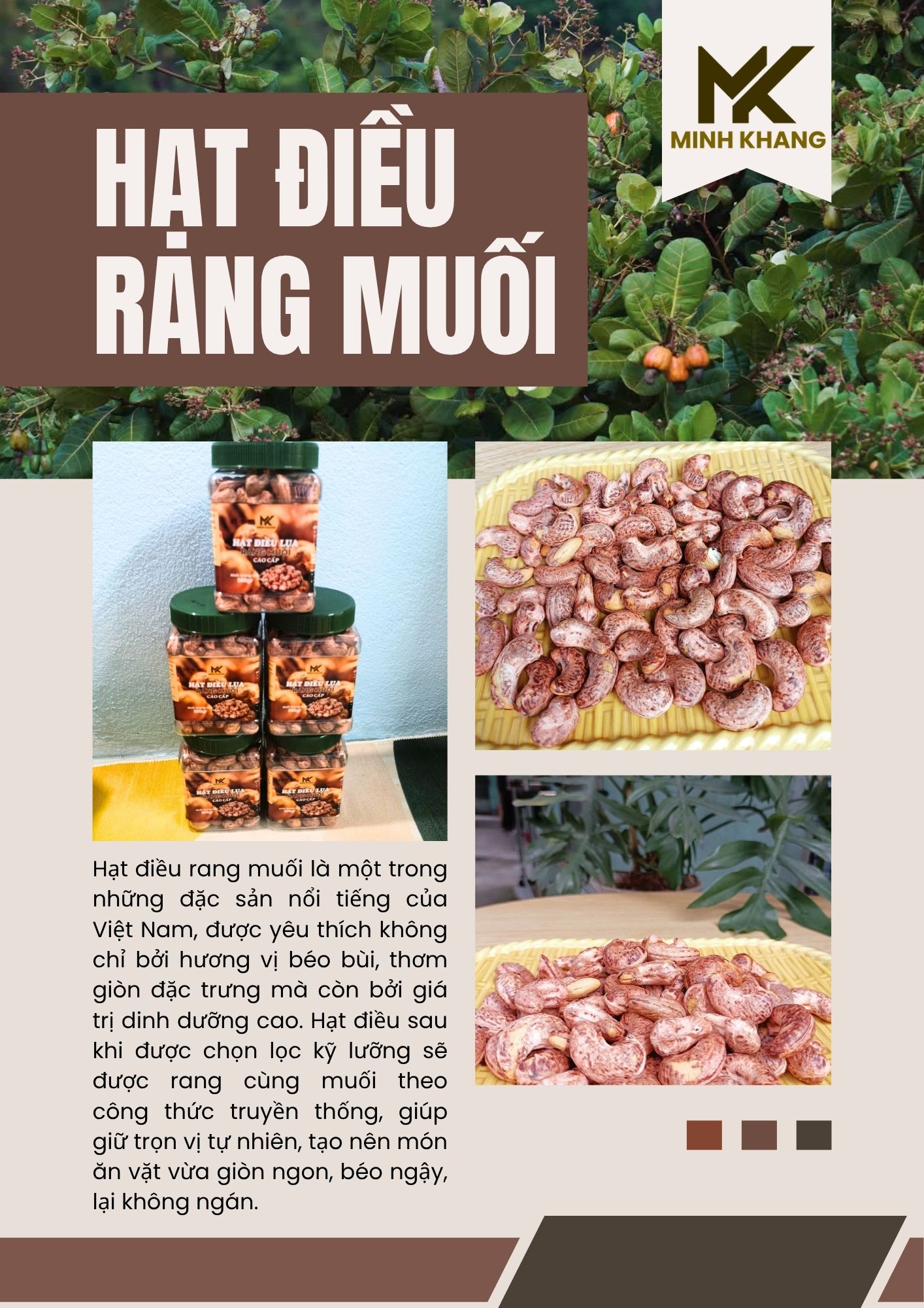 Hạt điều Tỏi Phô Mai Minh Khang là sự kết hợp độc đáo giữa vị bùi giòn tự nhiên của hạt điều loại 1 và vị phô mai béo ngậy hòa quyện cùng mùi tỏi thơm lừng. Ngay khi mở nắp, hương phô mai dịu nhẹ lan tỏa cùng lớp bột gia vị phủ đều trên từng hạt tạo nên sức hấp dẫn khó chối từ.